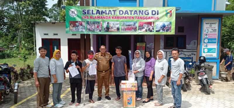 rEposisi.com- Kepala Dinas Sosial Provinsi Lampung Drs. Aswarodi M.Si, menyerahkan bantuan berupa peralatan Usaha Ekonomi Produktif (UEP) untuk usaha sate ayam, Minuman, dan sosis bakar, untuk dua orang disabilitas warga binaan LKS Alamanda bernama Heri dan Rahayu ningsih.