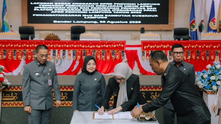 Penandatanganan dilakukan Wakil Gubernur Lampung Jihan Nurlela dan Wakil Ketua I DPRD Provinsi Lampung Kostiana dalam Rapat Paripurna Lanjutan di Ruang Sidang Paripurna DPRD Provinsi Lampung, Jum’at (8/8/2025).