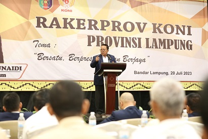 rEposisi.com – Gubernur Lampung Arinal Djunaidi membuka Rapat Kerja Komite Olahraga Nasional Indonesia (KONI) Provinsi Lampung, di Ballroom Hotel Emersia, Bandar Lampung, Kamis (20/7/2023).