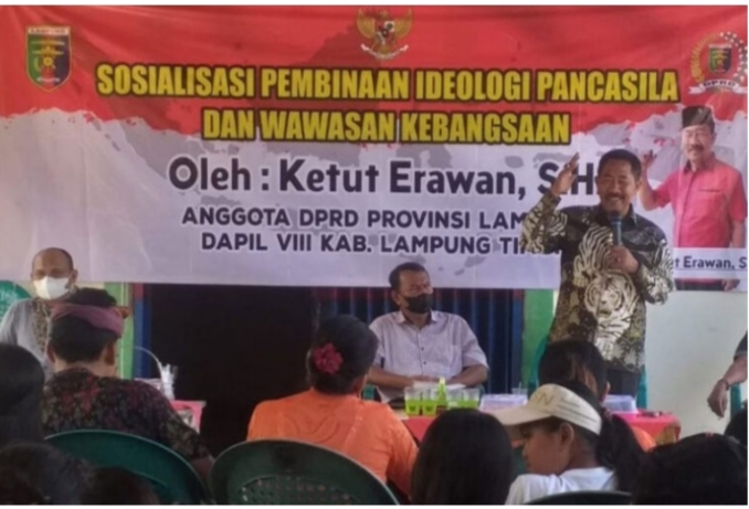 rEposisi.com – Anggota DPRD Provinsi Lampung, Ketut Erawan secara kontinu turun ke daerah pemilihannya guna menyampaikan tugas rutin sekaligus menyapa masyarakat melalui kegiatan sosialisasi Pembinaan Ideologi Pancasila dan Wawasan Kebangsaan (PIP-WK).