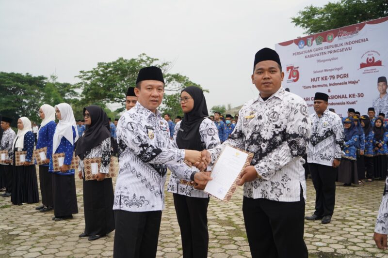 rEposisi.com – Upacara peringatan Hari Guru Nasional (HGN) ke-30 dan HUT ke-79 Persatuan Guru Republik Indonesia (PGRI) Kabupaten Pringsewu digelar di lapangan pemkab setempat, Senin (9/12/2024). Upacara yang dikuti para ASN pemerintah daerah beserta para guru ini dipimpin Pj Bupati Pringsewu Marindo Kurniawan sebagai pembina upacara.