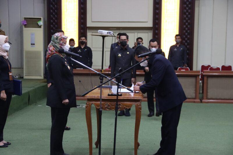 rEposisi.com- Wakil Gubernur Lampung Chusnunia melantik dan mengambil sumpah jabatan Pejabat Pimpinan Tinggi Pratama dan Pejabat Administrasi di Lingkungan Pemerintah Provinsi Lampung, di Gedung Pusiban, Selasa (12/7).